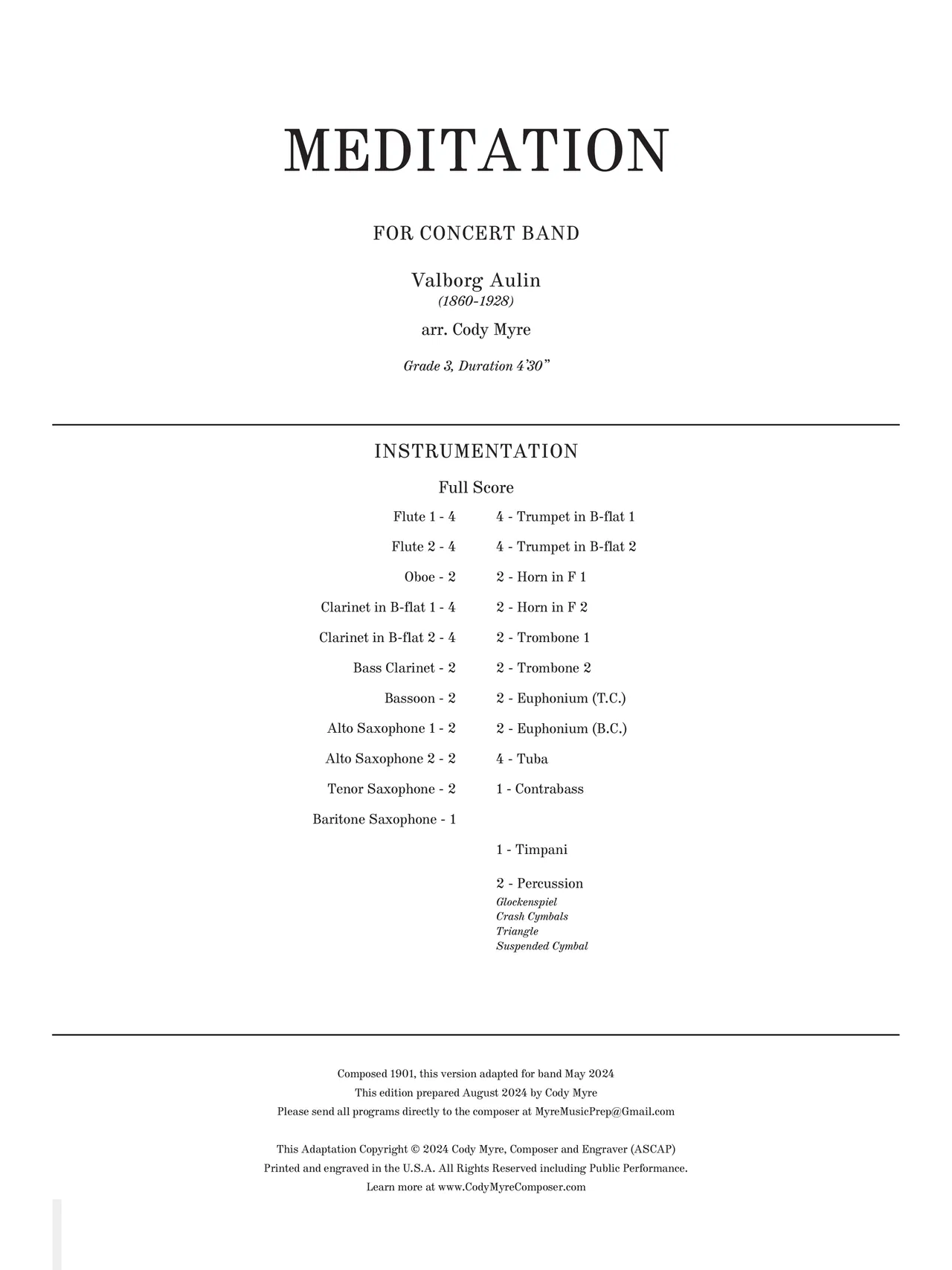 Meditation (1901) by Valborg Aulin, arr. Cody Myre