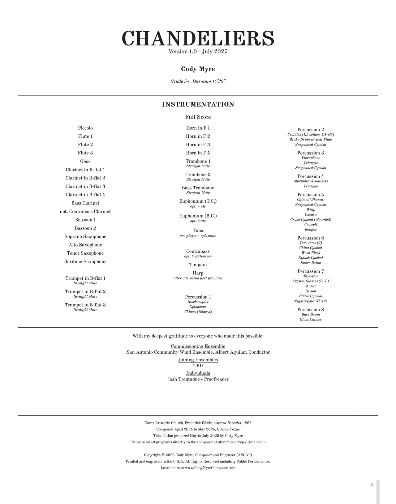 Begun with and supported by Albert Aguilar and the San Antonio Community Wind Ensemble (SACWE), Chandeliers is my deep dive into living with depression and anxiety and what it means to find beauty in life despite the challenges we face. From October 2022 to February 2023, unbeknownst to me, I was living through the most severe depressive episode of my life. I was formally diagnosed with severe depression and generalized anxiety (on top of my existing combined-type ADHD) in March of 2023 and began treatment soon after. Broken Glass was written during this time, in January of 2023. To this day, it remains one of my most difficult and sincere pieces. It is an exploration of rock bottom that I wrote at rock bottom. Though I didn’t realize it at the time, I was expressing my feelings in the piece that, no matter what I did, it would fail and everybody around me was just watching me fall, glad that it wasn’t them, much like one does if a waiter drops a glass in a restaurant. To this day I have not talked about this time openly, not even to my own family. Those who have experienced these hardships almost certainly understand this feeling and will probably also understand that I will likely never do so. They are painful memories and powerful emotions that drove me to my deepest lows, but also led to the decisions that define who I am today, over two years later at the time of writing.